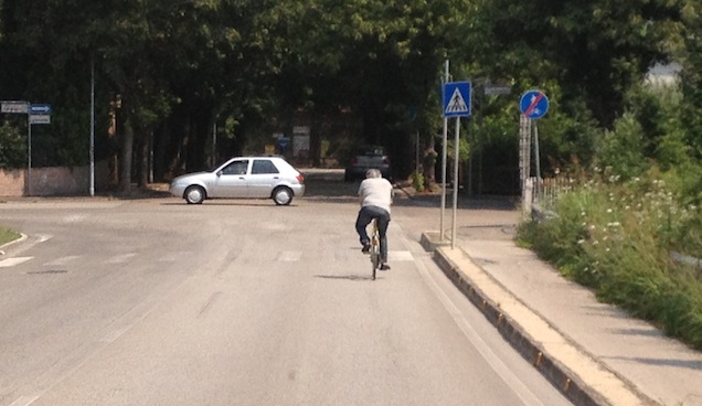 Ore 11.45 di mattina. Gradi sicuramente tanti, sopra ai 30°. In giro dalle ore 8.43. Riserve d’acqua terminate alle ore 10.30. Volgevo verso casa, dopo l’ultimo passo collinare affrontato senza preavviso, a causa di una maledetta deviazione stradale. Imboccato il faticosissimo tratto terminale della via del rientro, in preda alle allucinazioni che alternativamente mi proponevano cori gospel e la visione di personaggi improbabili a cui stavo in scia (tipo Malgioglio che pedalava cantando i Muse a squarciagola), è apparso lui: lo sverniciatore della strada.