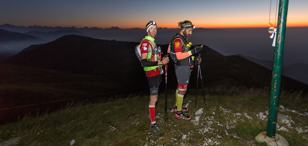 Controllo pettorali e giù per la pazza discesa di “Malga Val Vecchia” per andare ad imboccare la magnifica mulattiera di arroccamento del “Monte Boccaor” scavata nel fianco della cima a strapiombo sulla pianura. Stefano dell’organizzazione il giorno prima me l’aveva anticipato… “se passate le gallerie con il buio e con l’alba che carica…” detto fatto, puntualissimi, all’orizzonte il cielo sta prendendo sfumature di rosso giallo e blu indescrivibili, giunti in prossimit‡ della “Vedetta” del “Monte Archeson” la vista che ci si apre dinnanzi è “immobilizzante”… sembra di assistere ad “Un tramonto al contrario elevato al quadrato” esclama Fulmine, ci fermiamo 5 buoni minuti ad osservare il profilo in full HD delle Dolomiti, le nebbie fuligginose che dalle pianure risalgono i neri pendii ai nostri piedi e il sole che sta per incendiare la nera coperta punteggiata di Swarovsky che ricopre le nostre teste… a parole è il nulla ma sono viste che rimarranno impresse a lungo e per le quali la levataccia di mezzanotte è valsa sicuramente la pena!!!