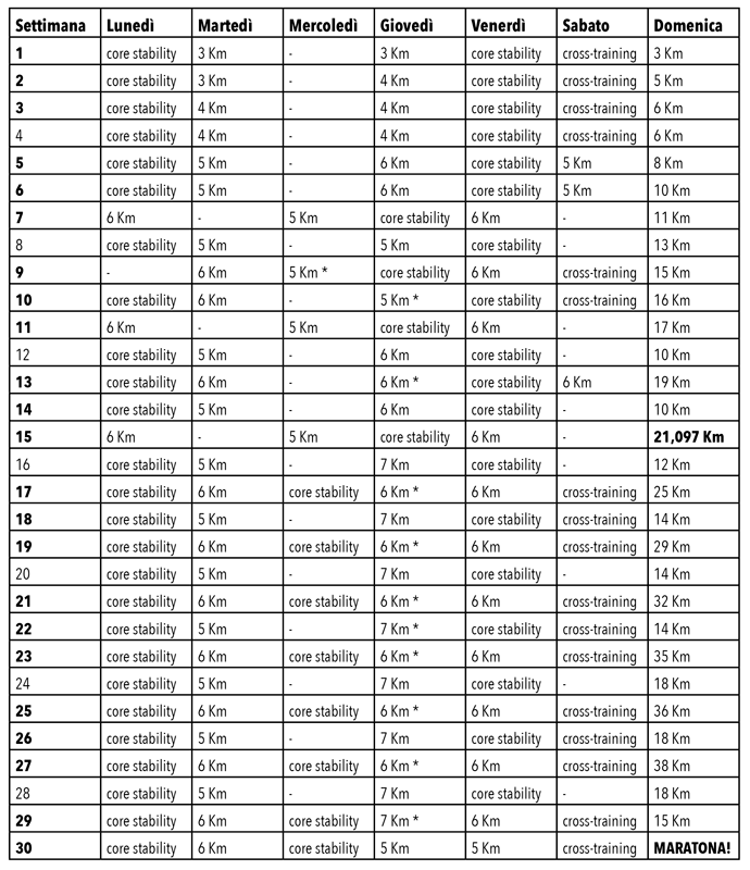 Ricorda che questo programma è dedicato alla preparazione della tua prima maratona. È studiato per portarti a percorrere 42,195 Km senza particolari obiettivi di tempo o ritmo ma, semplicemente, ti accompagna dalla partenza all’arrivo. Non sono previsti allenamenti sulla velocità ma solo sulla resistenza; soltanto le sessioni che sono indicate dall’asterisco (*) prevedono un Allenamento Progressivo con un costante e leggero aumento della velocità dall’inizio alla fine. Ricorda sempre di fare riscaldamento prima di allenarti e lo stretching dopo. E di fare la visita medica, sempre!