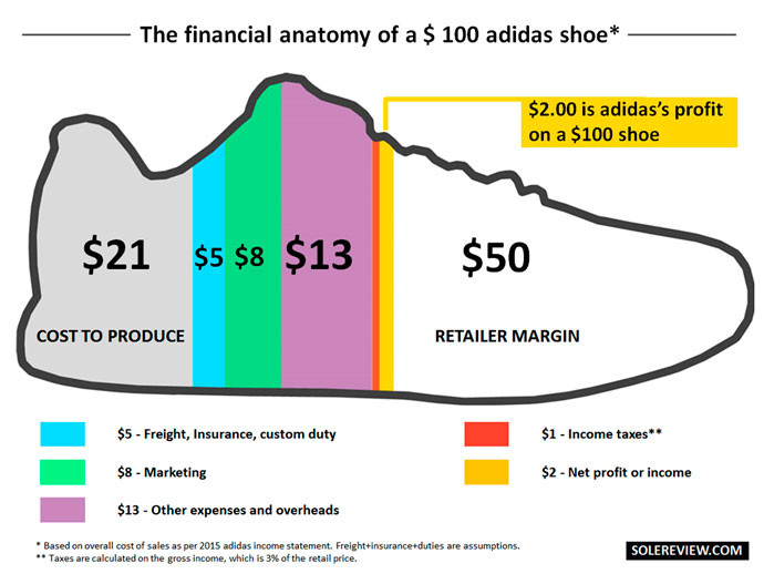 Come vedi da questo grafico (relativo a una media per le scarpe adidas), su una scarpa che, di listino, costa $100 adidas trae un profitto di $2, tutti gli altri se ne vanno in costi di produzione (e a essa correlati), marketing, tasse e spese varie.