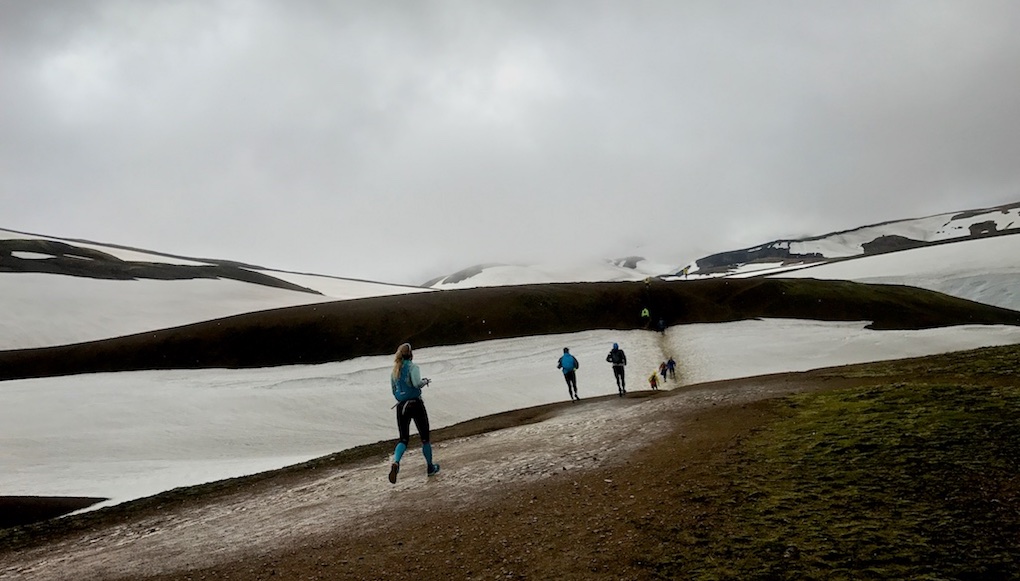 La mattina del primo giorno sono uscito dalla mia tenda a Landmannalaugar (con sensi di colpa da Runner a palla) e ho visto qualche centinaio di persone, vestite da corsa… nel bel mezzo del niente islandese. Pronte a correre una ultra maratona (esattamente una 55k) sullo stesso identico percorso su cui avrei camminato nei 4 giorni successivi. “Mi prendete in giro? Voi pazzi, folli, maniaci, fuori di testa…” ho pensato amorevolmente tra me e me. E ancora “55 chilometri di salite, neve, guadi, aree vulcaniche. Io non sarò mai, MAI, così pazzo”.