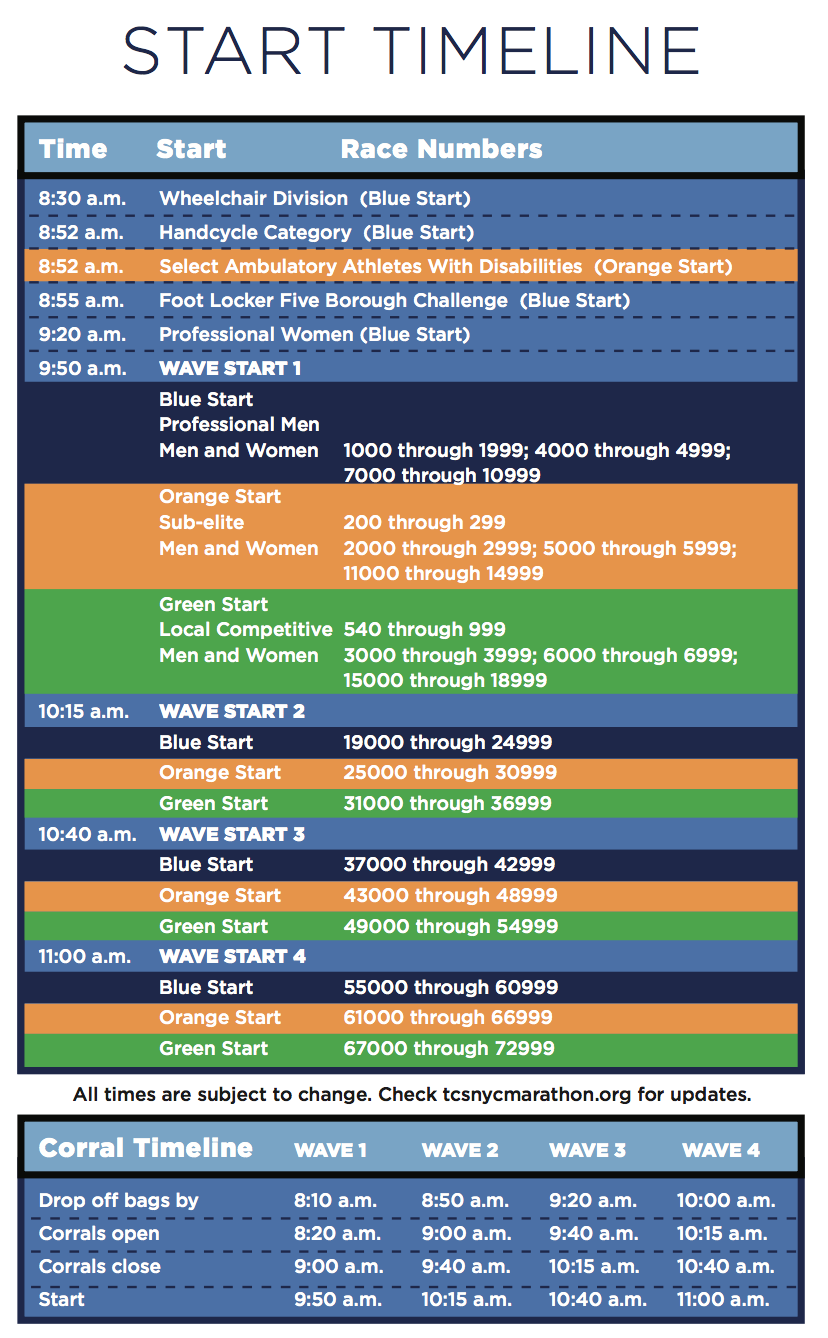 Ad esempio come riportato nel sito della TCS NYC Marathon se si parte nella Wave 1: