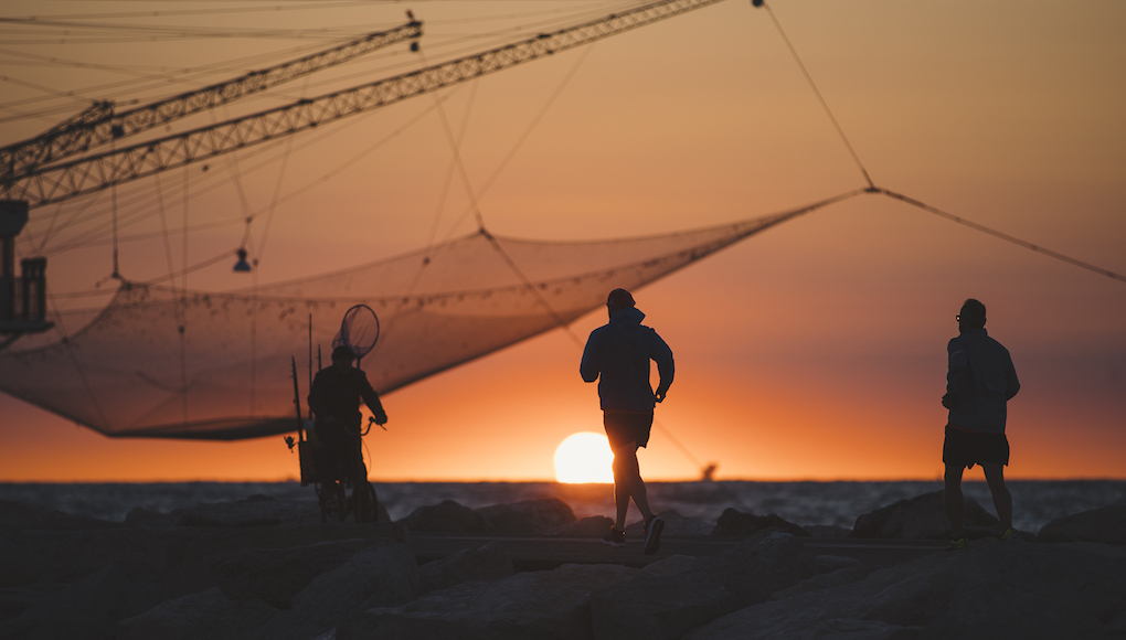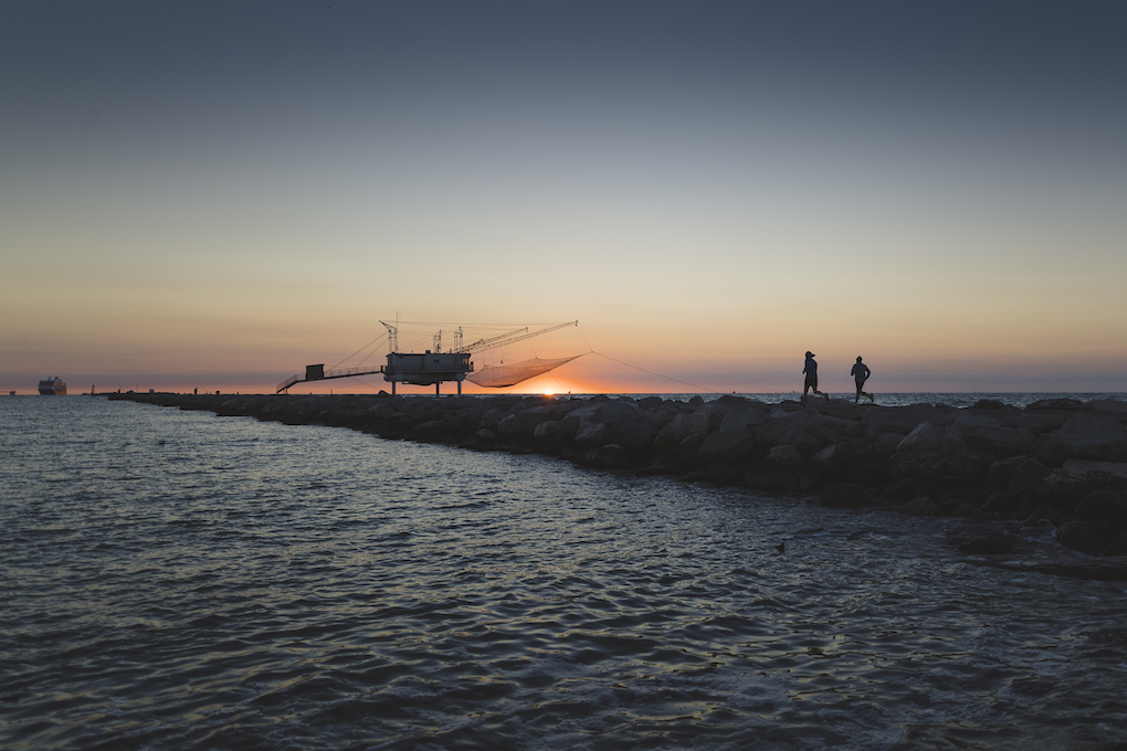 Puntuale vediamo all’orizzonte una piccola falce di luce più vivida che si riempie sempre di più e velocemente man mano che passano i secondi. Non servono neanche minuti: qualche istante e la circonferenza del sole si riempie e sbuca all’orizzonte, irradiandoci. Tutto si fa più nitido e ancora più surreale. Siamo solo noi a correre, assieme a qualche pescatore della domenica. Attorno il silenzio e lo spettacolo che si rinnova ogni giorno. Anche la Romagna sa essere un luogo silenzioso e quasi misterioso, ogni mattina. Lo è ancor di più quando te ne accorgi mentre corri dove non dovresti, cioè quasi sulla superficie del mare.