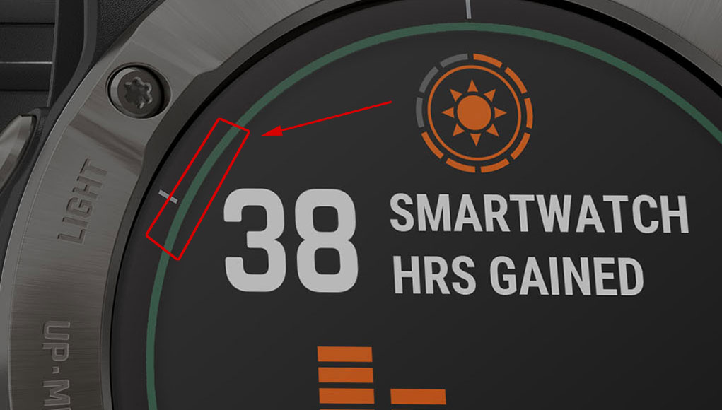 Come ti anticipavo il Fenix 6X Pro può essere acquistato anche in versione Solar. In questa versione, il quadrante ha una piccola ghiera (indicata in rosso nella foto) realizzata con celle fotovoltaiche con efficienza fotovoltaica del 100%. Le celle fotovoltaiche sono presenti anche sotto al display e quindi in una grande superficie ma, in questo caso, la loro efficienza scende al 10% a causa della copertura del display.