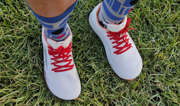 La prima delle cose che si fa notare in questa versione è la pianta larga, molto più larga rispetto al modello precedente, in linea con quanto fatto da Altra per i recenti modelli da strada e da trail, confermando l’intenzione di dare più importanza alla possibilità che il piede e in particolare le dita si muovano in modo completamente naturale all’interno della scarpa, soprattutto nel momento più delicato della corsa, quello dell’impatto al suolo. Che le dita siano libere di muoversi lateralmente, allargandosi e tornando ad avvicinarsi nella parte anteriore della scarpa, non significa però che il piede ci scivoli dentro, perché la tomaia in knit ha una elasticità incredibile e sembra quasi una seconda calza sul piede, restituendo una sensazione di protezione e stabilità inattesa al tatto, e la conchiglia del tallone morbida segue in tutto e per tutto il movimento del sistema caviglia-piede. Forse a causa della componente elasticizzata del knit, il peso della scarpa è leggermente superiore a quanto Altra era solita fare con i modelli della serie Escalante, circa 260 grammi per la misura 9. Il fattore peso è però rilevante solo sulla carta, visto che non si percepisce assolutamente sotto i piedi, grazie all’ottimo bilanciamento e al fatto che (eh sì!) anche questo modello è un modello drop 0, pertanto la differenza di altezza dal terreno tra tallone e punta della scarpa è tecnicamente nulla, anche se la progettazione e ciò che la scarpa restituisce in termini di sensazioni sotto i piedi non ti fanno mai pensare a questo aspetto. Il merito è in gran parte di ciò che sta tra la soletta e il terreno, e anche qui abbiamo due belle novità.